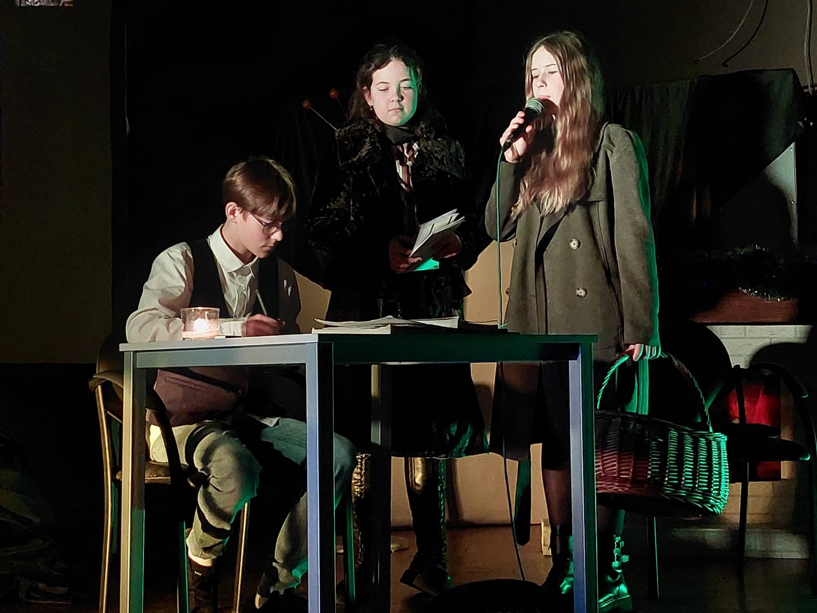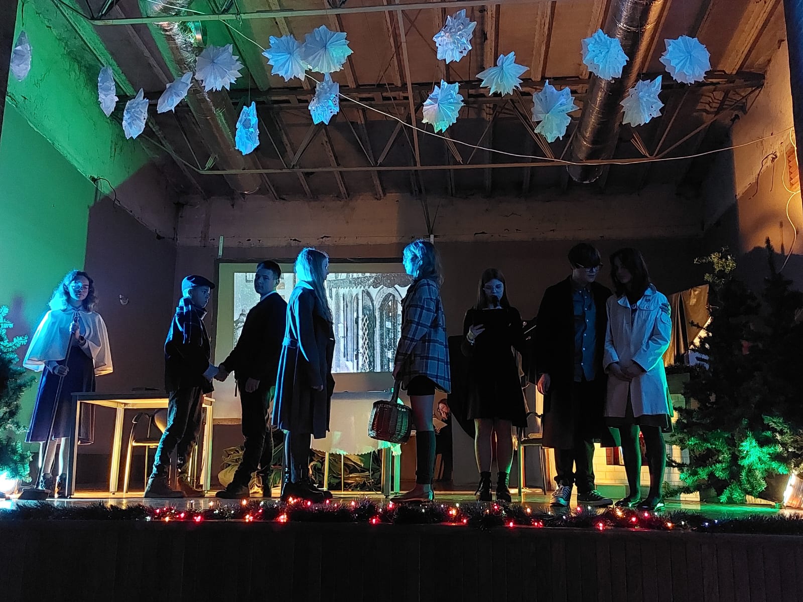 Właśnie z tego powodu 22 grudnia uczniowie z Kółka Teatralnego i szkolnego chóru zaprezentowali widowisko pt. „Opowieść wigilijna”. Losy Ebenezera Scrooge’a przypomniały o tym, że żyjemy przede wszystkim dla poświęcenia i dobra innych ludzi. Nie gonitwa za majątkiem powinna być wyznacznikiem człowieczeństwa. Trzeba wspierać innych w trudnych chwilach i darować im samego siebie, swoją obecność...