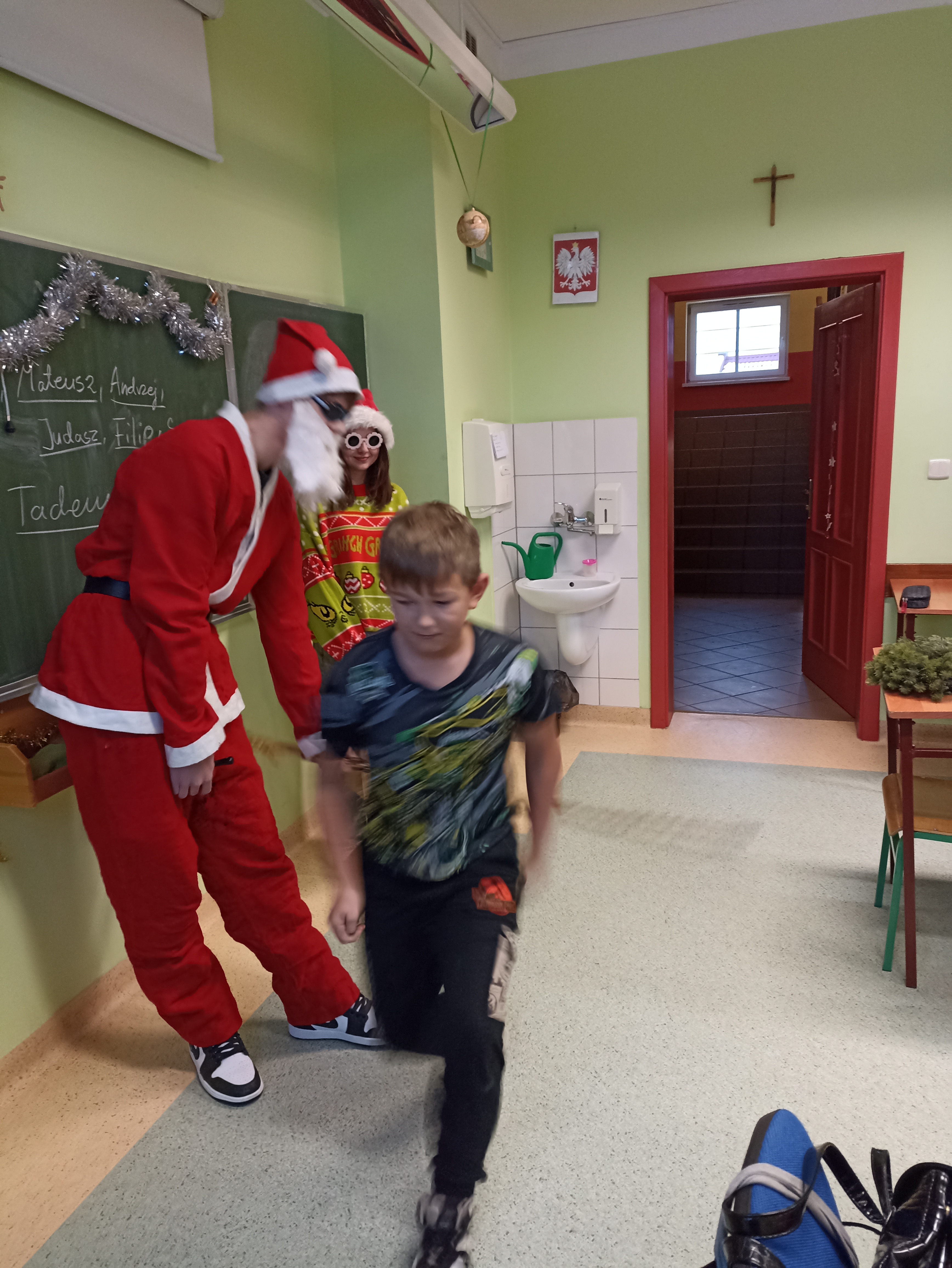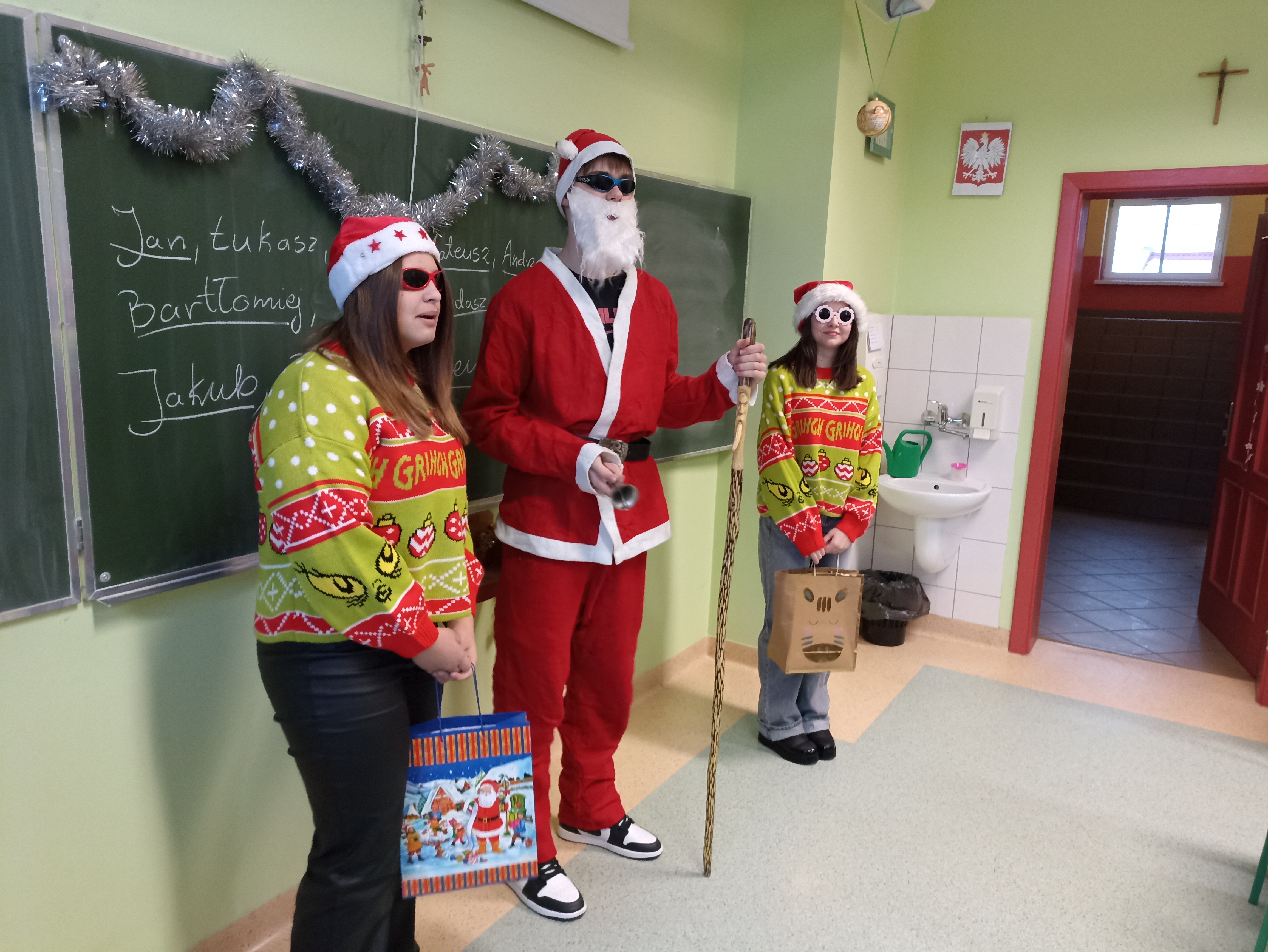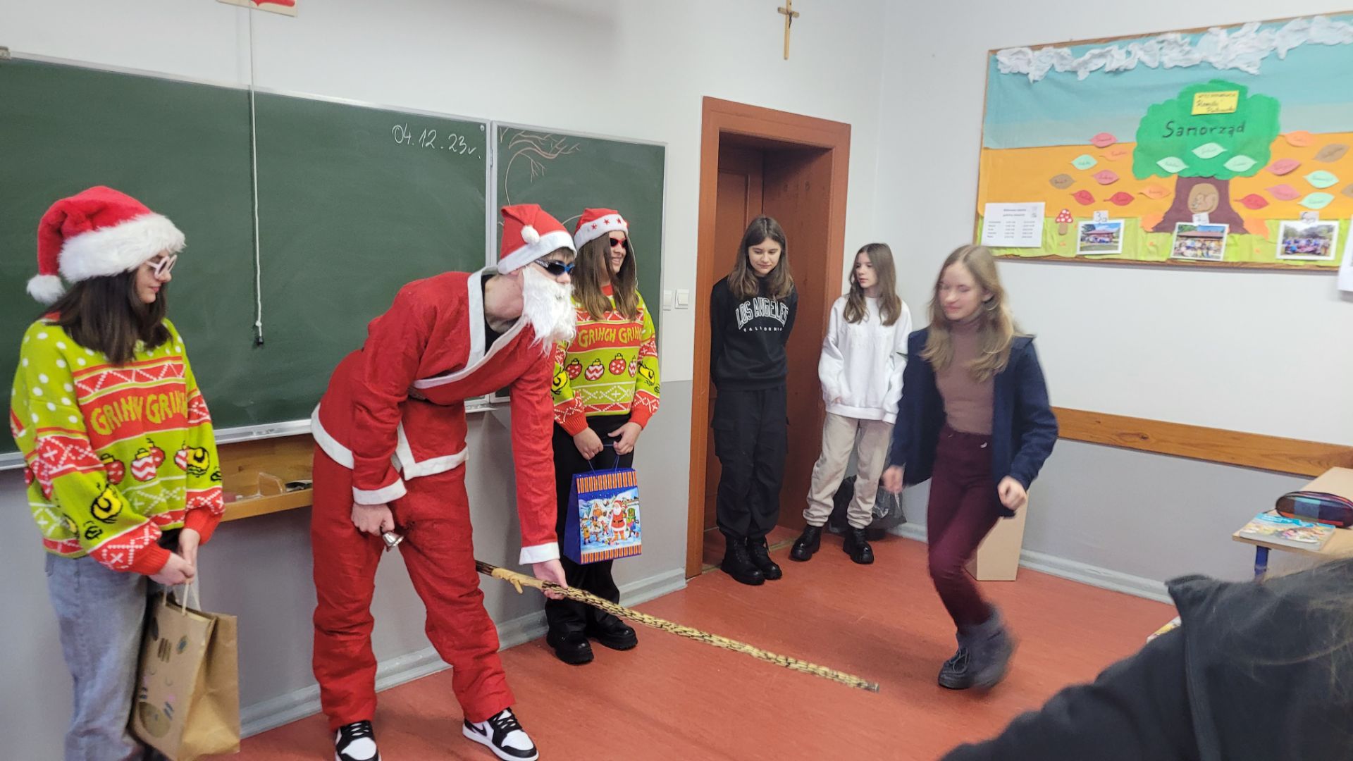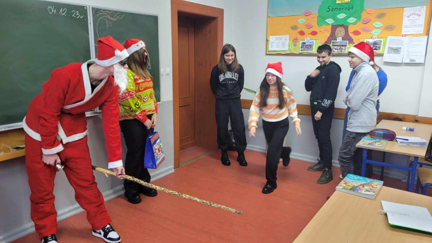 I przybył … uczniowie w klasach 4-8 doczekali się wizyty Mikołaja. Usłyszeliśmy dzwonek i pojawił się nasz „miły gość” i jego pomocnice.