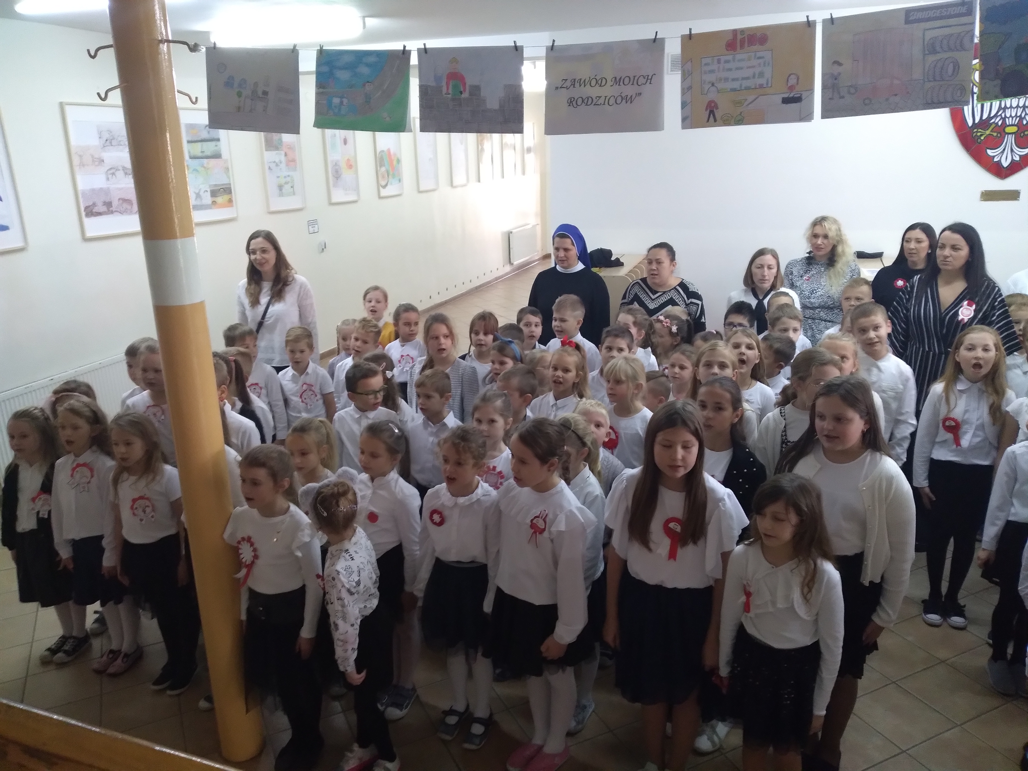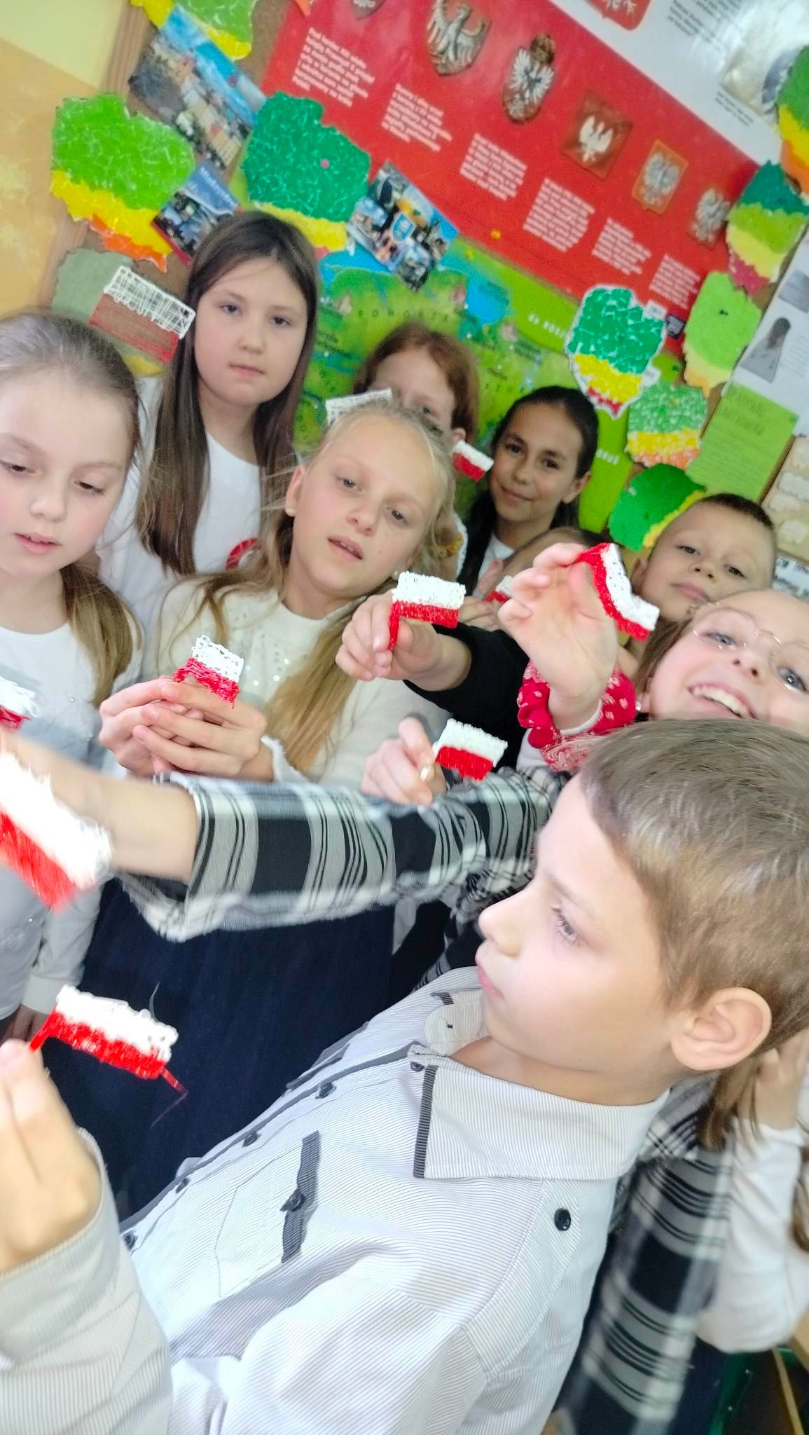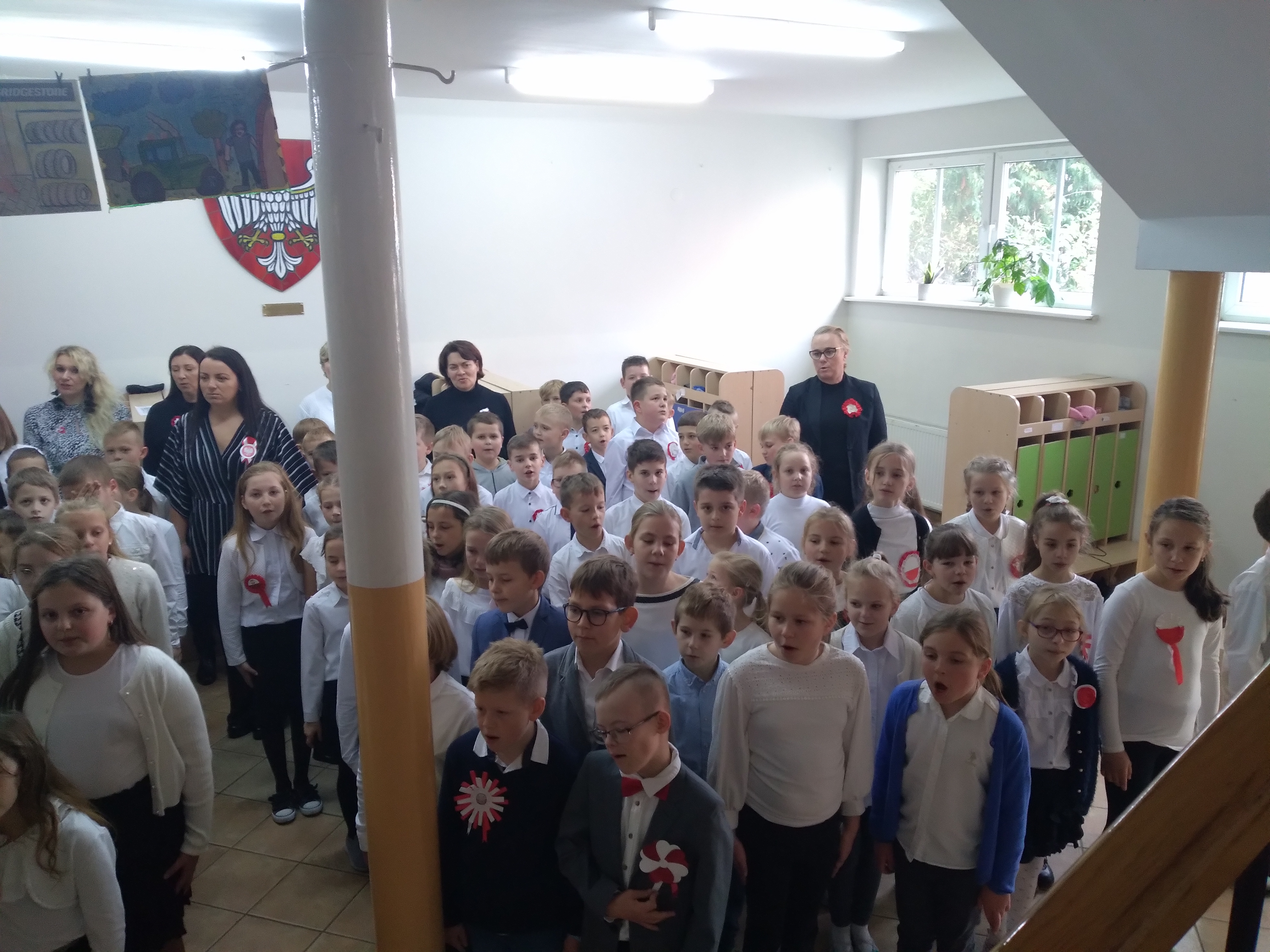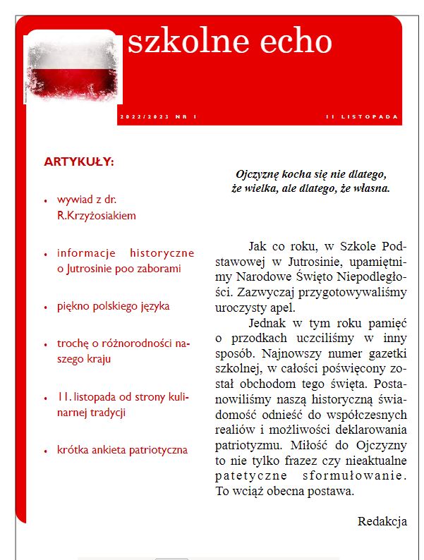 Jak co roku, w naszej szkole, upamiętniliśmy Narodowe Święto Niepodległości. Na szkolnych korytarzach i w klasach pojawiły się gazetki okolicznościowe, uczniowie wykonali kotyliony oraz prace plastyczne o tematyce patriotycznej. Dokładnie o godzinie 11.11 wszyscy uczniowie wraz z nauczycielami odśpiewali hymn narodowy. Wspaniały prezent, w postaci gazetki szkolnej, otrzymaliśmy od redakcji Szkolnego Echa. Ten numer w całości poświęcony obchodom tego najważniejszego dla Polaków święta dostępny jest na stronie szkoły!