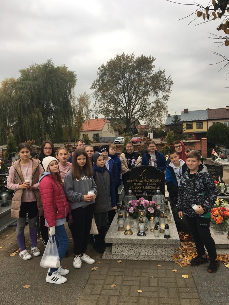Okres po Świecie Zmarłych to odpowiedni moment na refleksję o tych, którzy odeszli od nas, czas na rozmowy dotyczące szacunku dla zmarłych. Dnia 04.11.2022r. uczniowie klasy 6a pod opieką nauczyciela wybrali się na cmentarz w Jutrosinie, aby w zadumie pomodlić się i wspomnieć swoich bliskich zmarłych. Zapalili również znicze na grobie patrona szkoły Władysława Bartkowiaka. Jesienna pogoda zachęciła do spaceru alejkami cmentarza, gdzie można było dostrzec zadbane i ozdobione kwiatami oraz zniczami groby naszych bliskich.