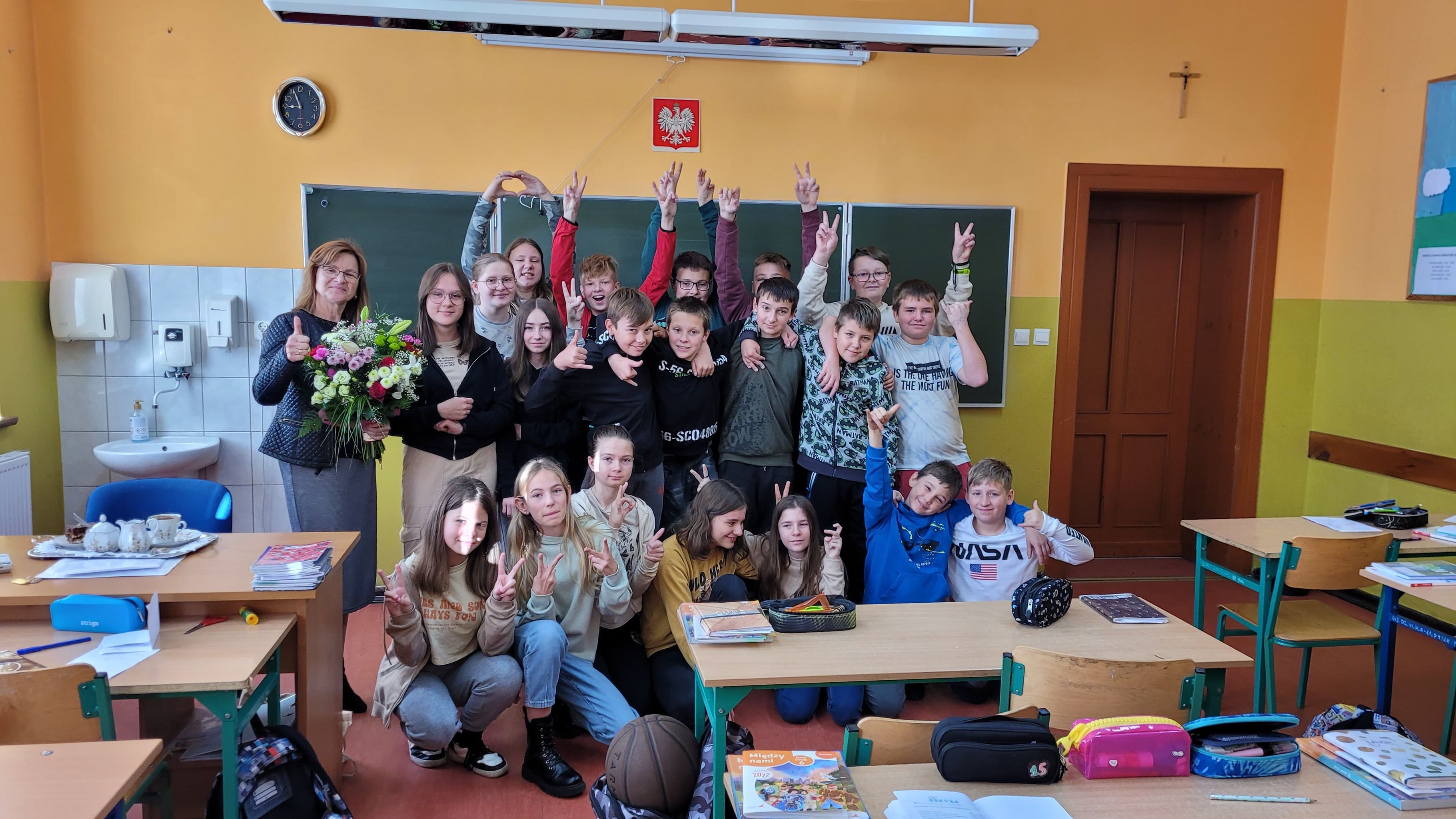 W tym dniu, uczniowie klasy 6a pamiętali również o wychowawcy, swoich nauczycielach. Było tradycyjne "Sto lat", miłe życzenia, pachnące kwiaty, kawka i dobre ciacho.