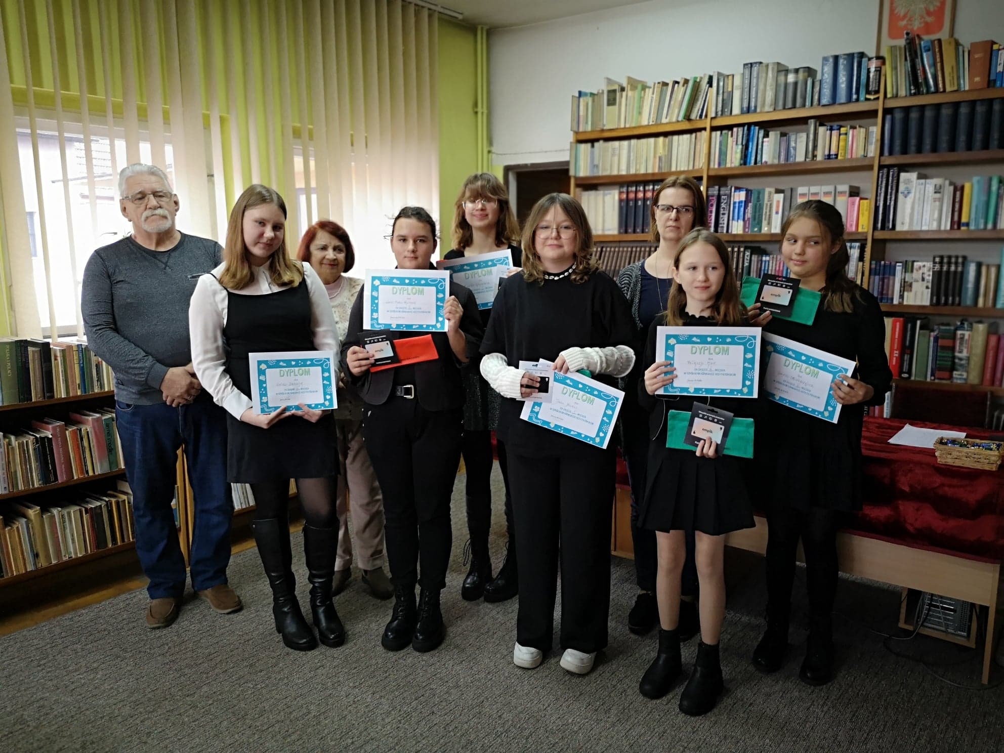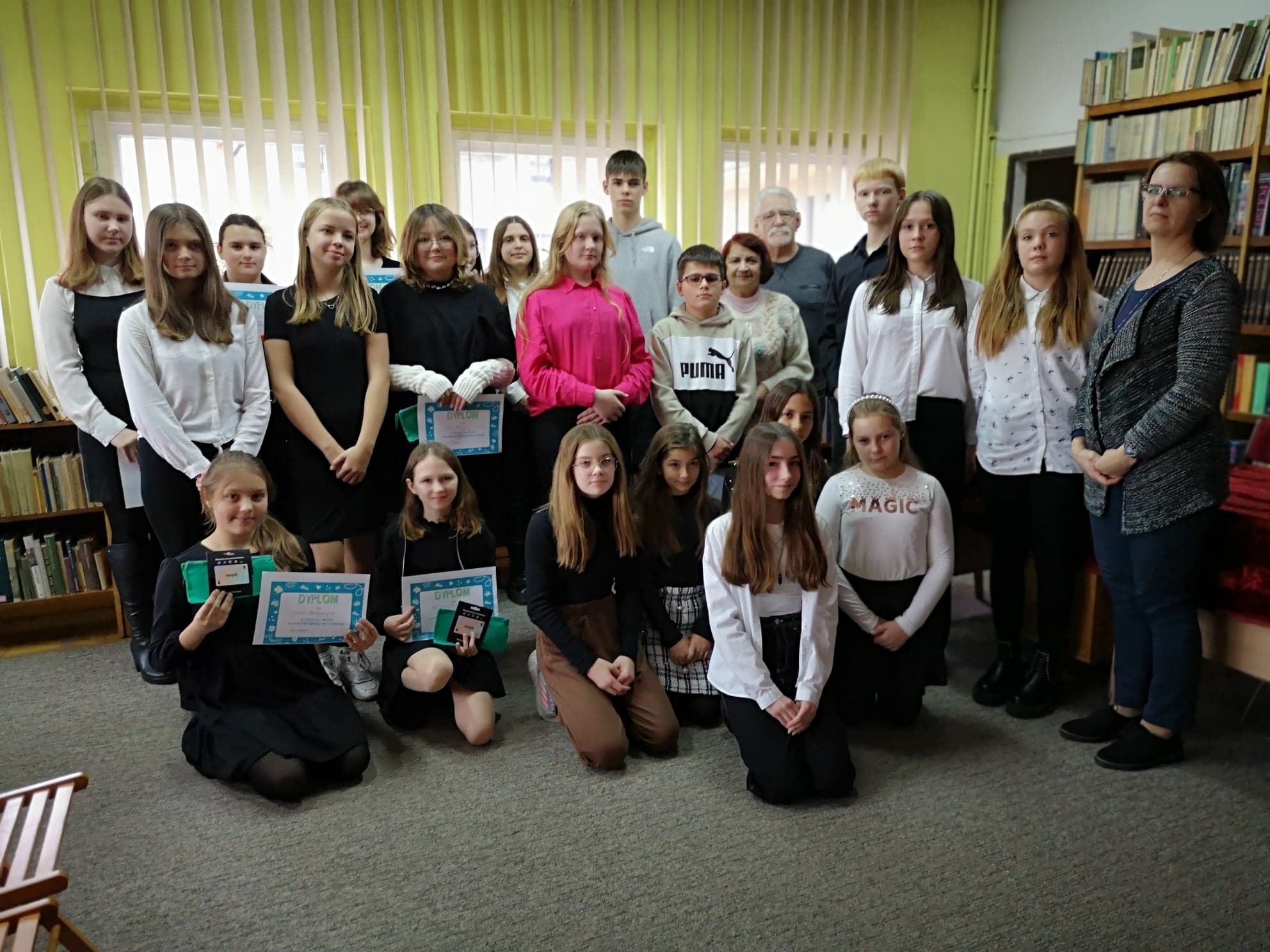 Dziękujemy wszystkim uczestnikom za udział w konkursie oraz gratulujemy zwycięzcom, dla których nagrody zostały ufundowane przez Radę Rodziców naszej szkoły. Na zakończenie gorące podziękowania dla Pani Kamili Malechy za udostępnienie pomieszczenia biblioteki oraz pomoc w zorganizowaniu konkursu.
