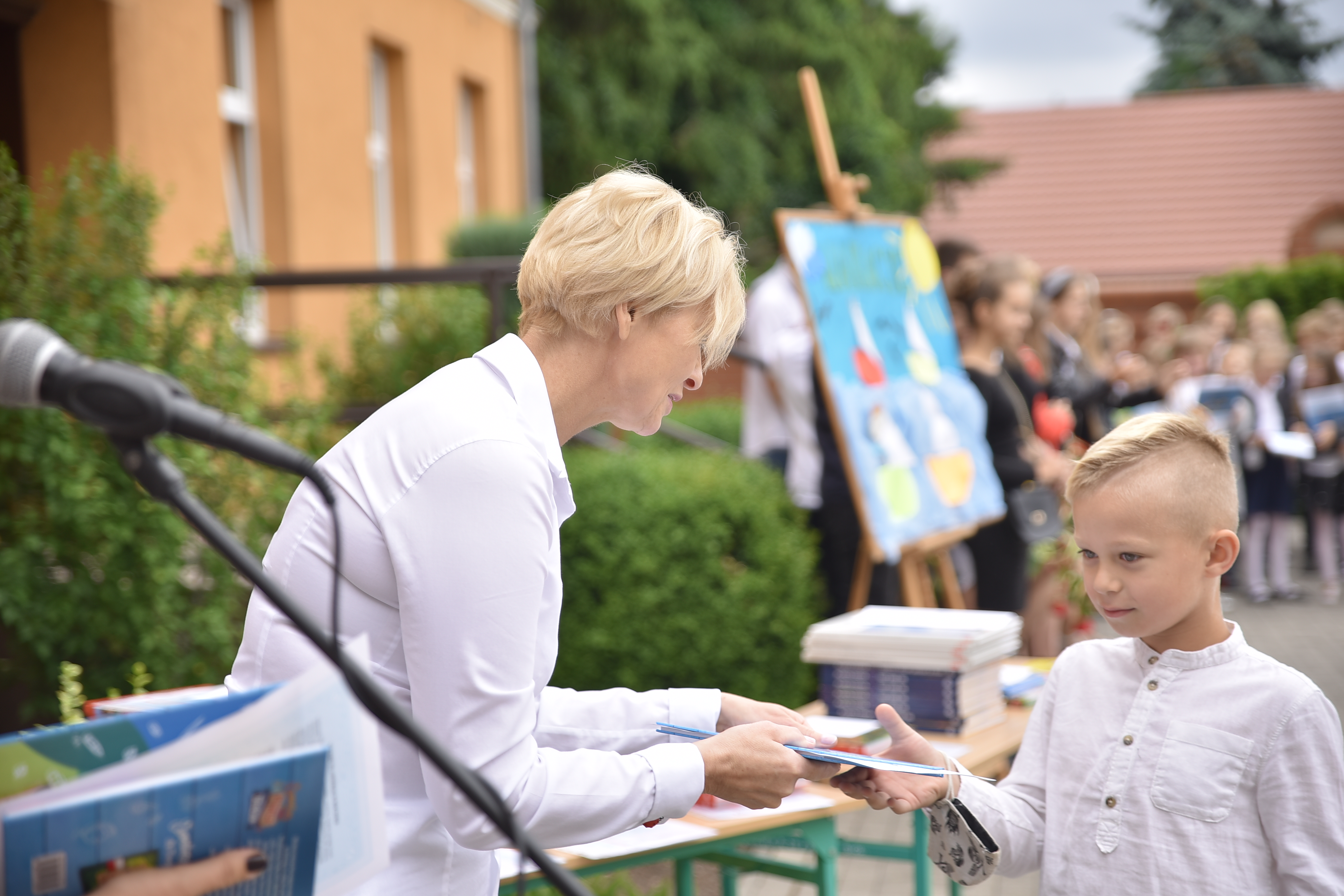 Następnie na boisku szkolnym p. dyrektor D. Ugorek wręczyła świadectwa z wyróżnieniem oraz nagrody uczniom, którzy osiągnęli wysokie wyniki w nauce oraz 100% frekwencję.