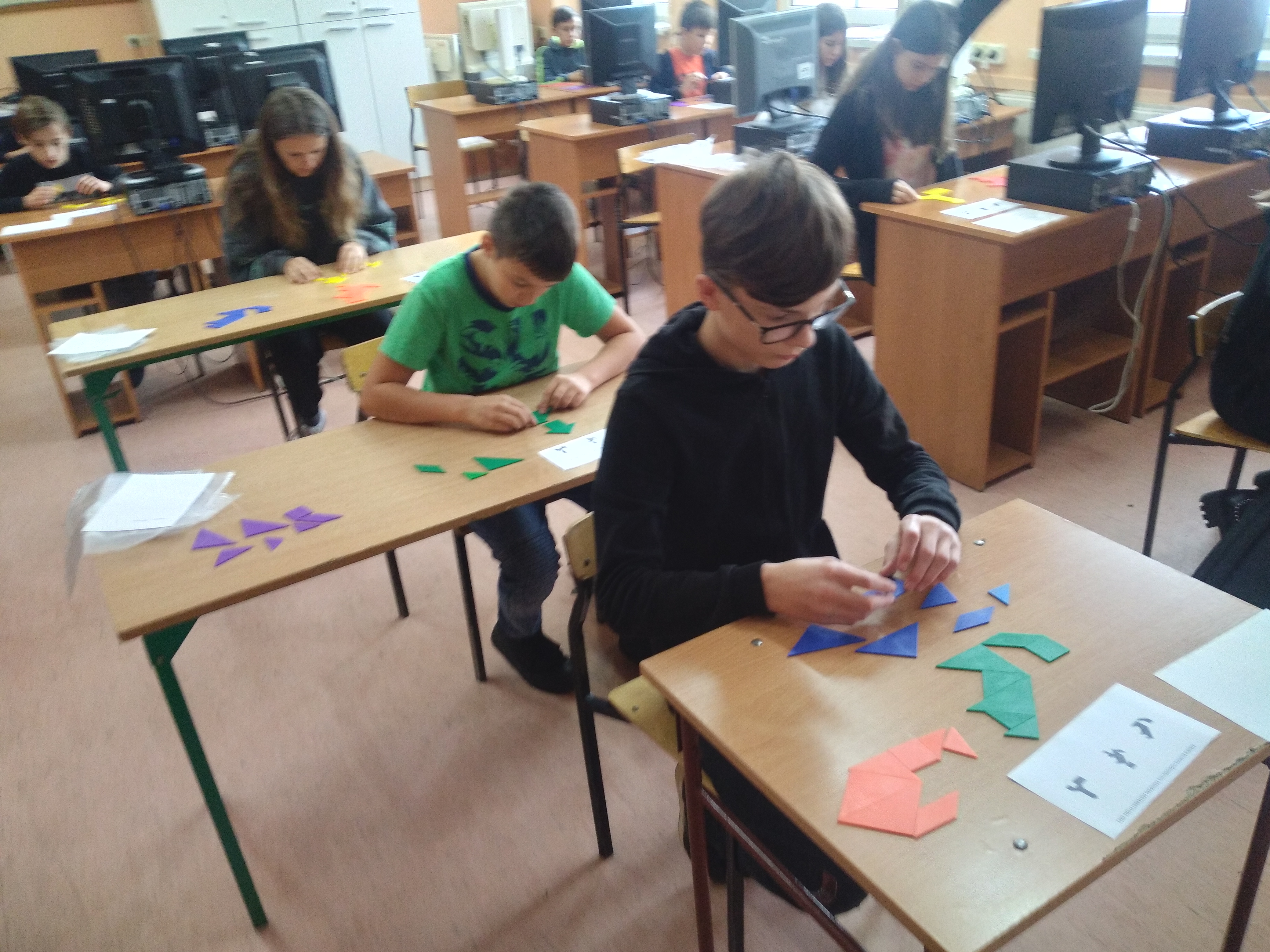 Dnia 6.11.23, w naszej szkole odbył się szkolny etap konkursu “Tangram matematyczny”. Wzięło w nim udział 16 uczniów klas 4-8. Konkurs polegał na ułożeniu w czasie 20 min. 3 tangramowych figur.