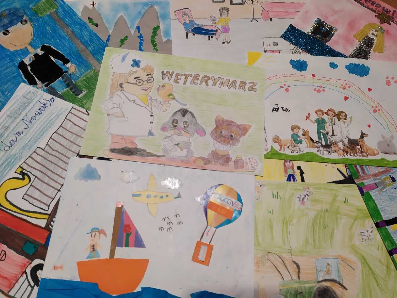 Konkurs dla młodszych uczniów naszej szkoły cieszył się bardzo dużym zainteresowaniem. Otrzymaliśmy 71 pięknych prac konkursowych, z czego komisja konkursowa w składzie Anna Kaczor, p.dyrektor Dominika Ugorek oraz Danuta Błach wybrała 12 prac, które wyróżniały się pomysłowością, starannością oraz wkładem pracy. Przyznano dwa I miejsca, dwa II miejsca, dwa III miejsca oraz 5 wyróżnień. Wśród zawodów, o których marzą nasi młodzi uczniowie, znalazł się m.in.: weterynarz, policjant, mechanik, piosenkarka, przewodnik górski, kosmetyczka, fryzjerka, kierowca tirów, rolnik, policjant, piłkarz, pielęgniarka, podróżnik, strażak, kierowca rajdowy, malarka, sprzedawca, ratownik górski, tancerka, chemik, fotograf, treserka koni, nauczyciel, a nawet latarnik i Youtuber.