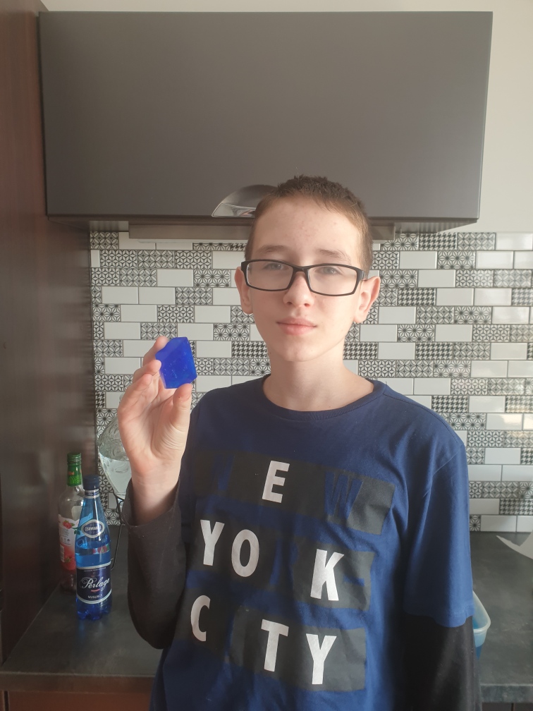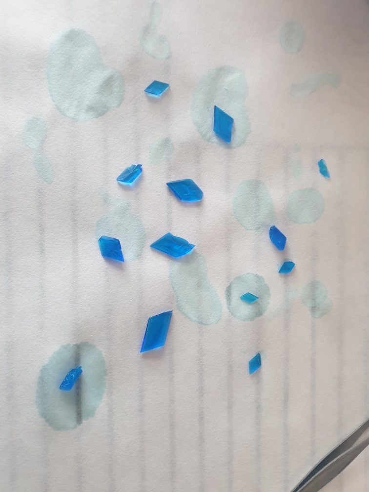 4. 12.04.2020 został zrobiony roztwór. Wlane zostało ok. 1l gorącej wody i wsypano ok. 70 g siarczanu miedzi(II) (w tym przypadku kryształy niestety częściowo rozpuściły się. Zrobiły się mniej krystaliczne i straciły częściowo swój wygląd. Powodem była zbyt wysoka temperatura )