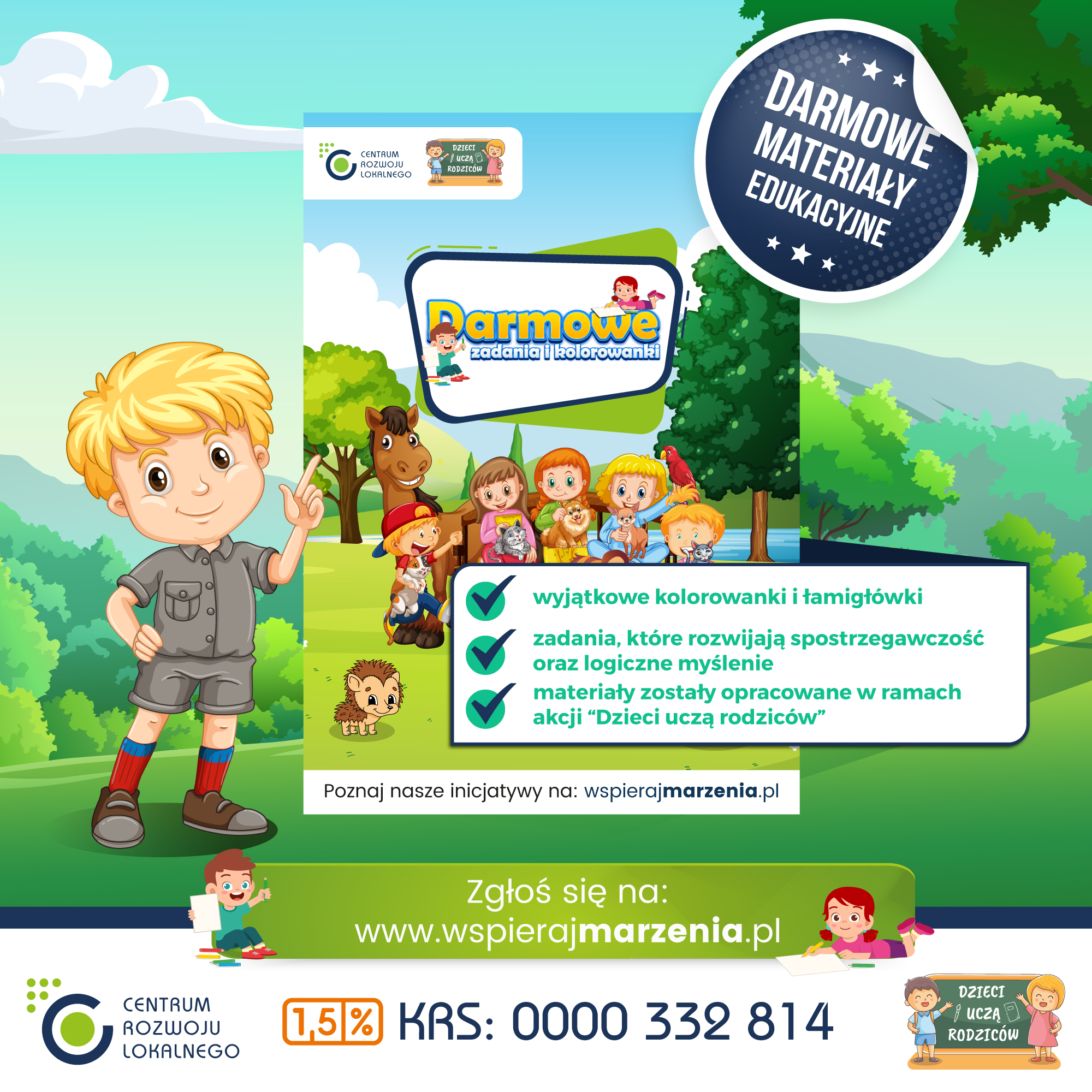 Drogi rodzicu! Szukasz ciekawego sposobu na wspólne spędzanie czasu ze swoją pociechą? 👨👩👧👦 A może szukasz darmowych materiałów do nauki? Zgłoś się i otrzymuj, opracowane przez Centrum Rozwoju Lokalnego darmowe pakiety edukacyjne w formie elektronicznej.