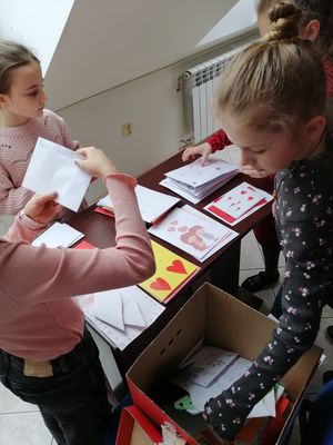 Tradycyjnie, już po raz kolejny zorganizowana została „poczta walentynkowa”. Wszyscy, którzy chcieli przekazać życzenia, wrzucali do skrzynki kartki walentynkowe, serduszka (w większości wykonane samodzielnie). Trzeba przyznać, że szkolni listonosze nie narzekali na brak pracy. Segregowali pocztę i roznosili do klas korespondencję od tajemniczych wielbicieli-😊